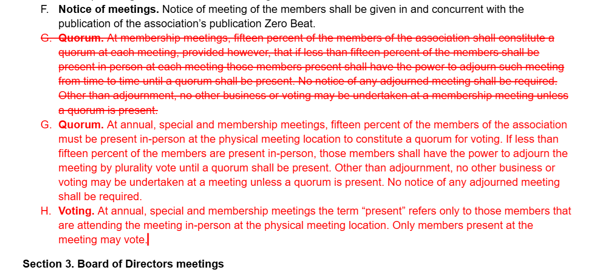 This change was presented at the January general meeting and will be voted on at the February meeting. This changes clarifies the meaning of “present” in “Voting” under “Membership meetings” (Article IV). View the proposed change here